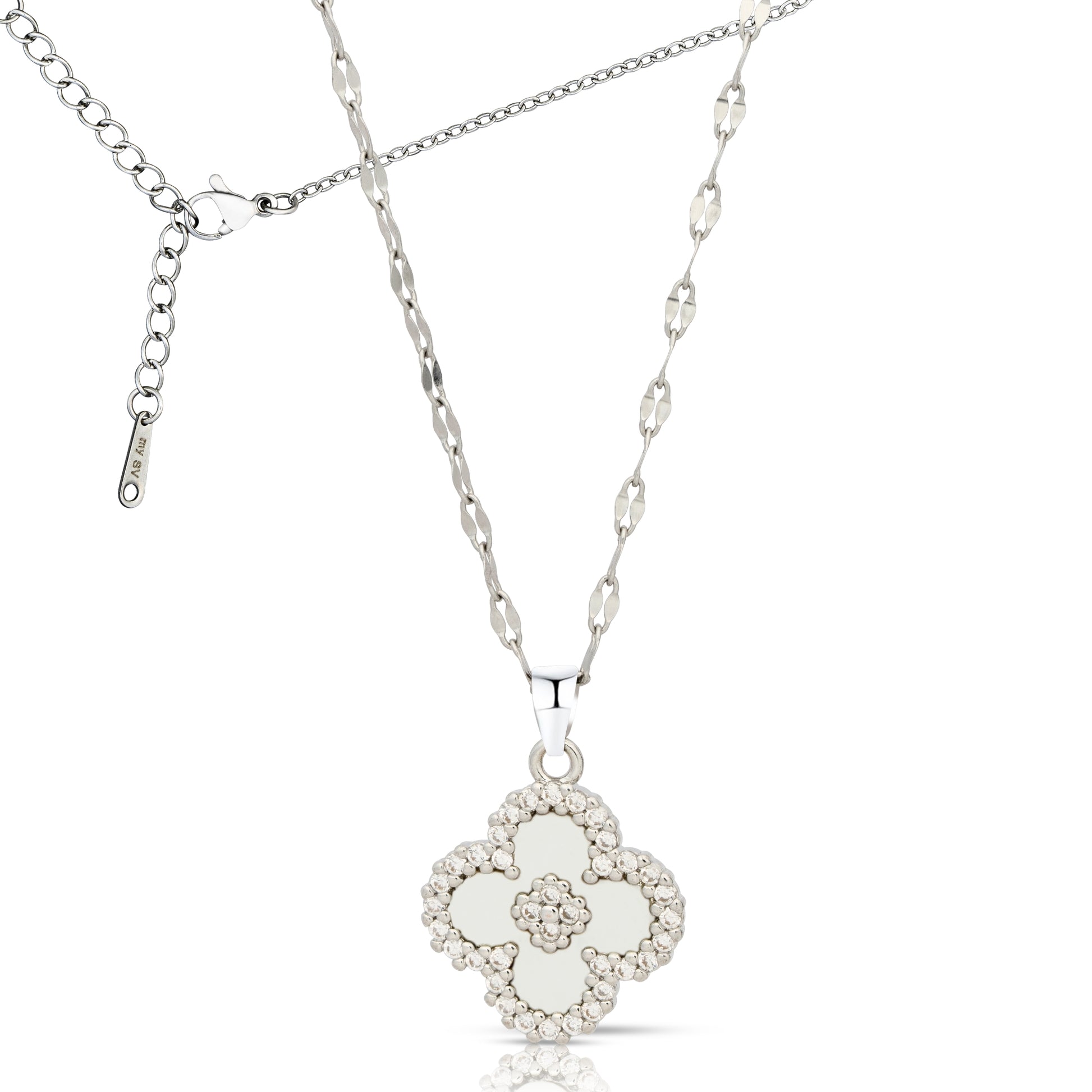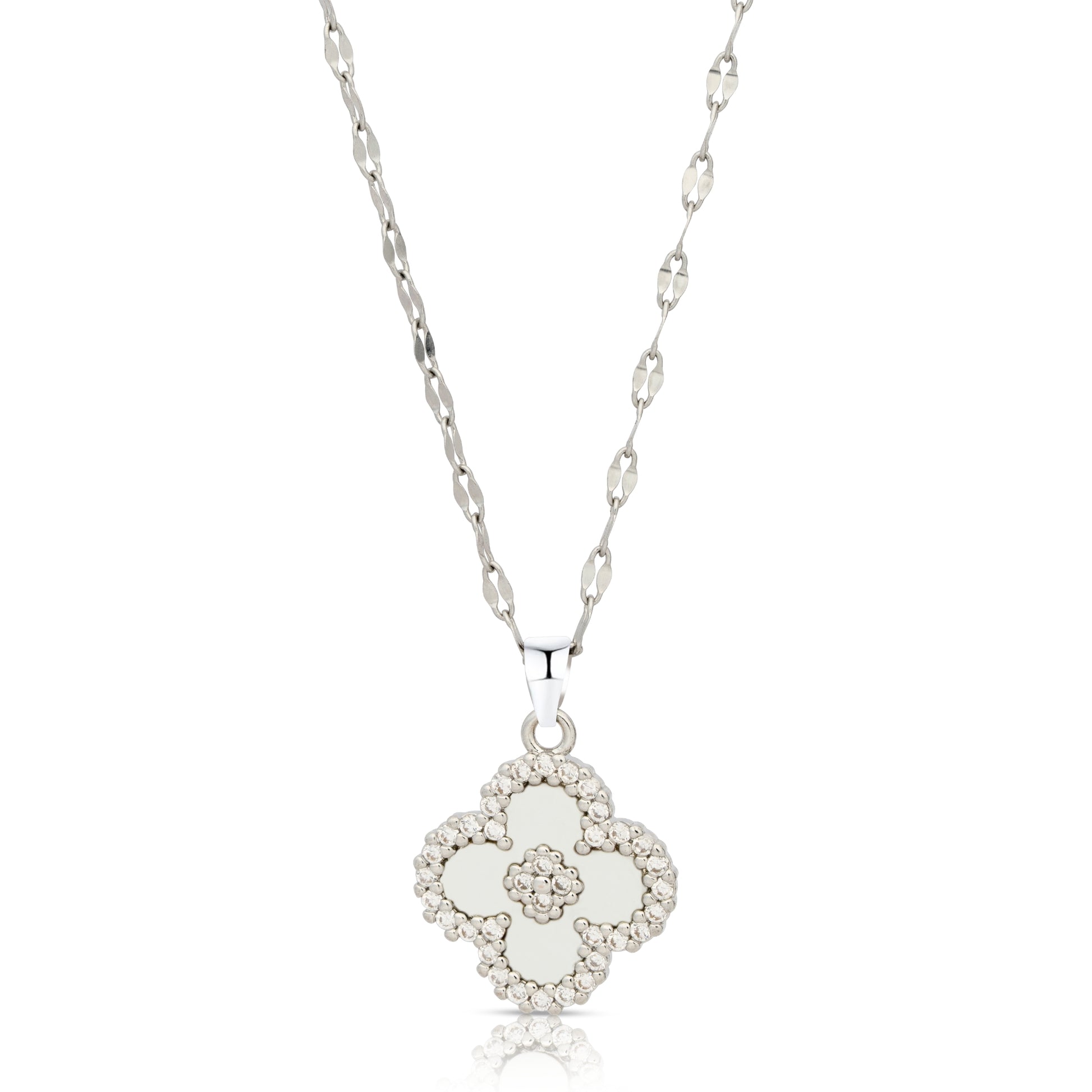 18K White Gold Plated Necklace Four Leaf Clover Pendant Necklace w/White Shell & Cubic Zirconia – Gift Jewelry