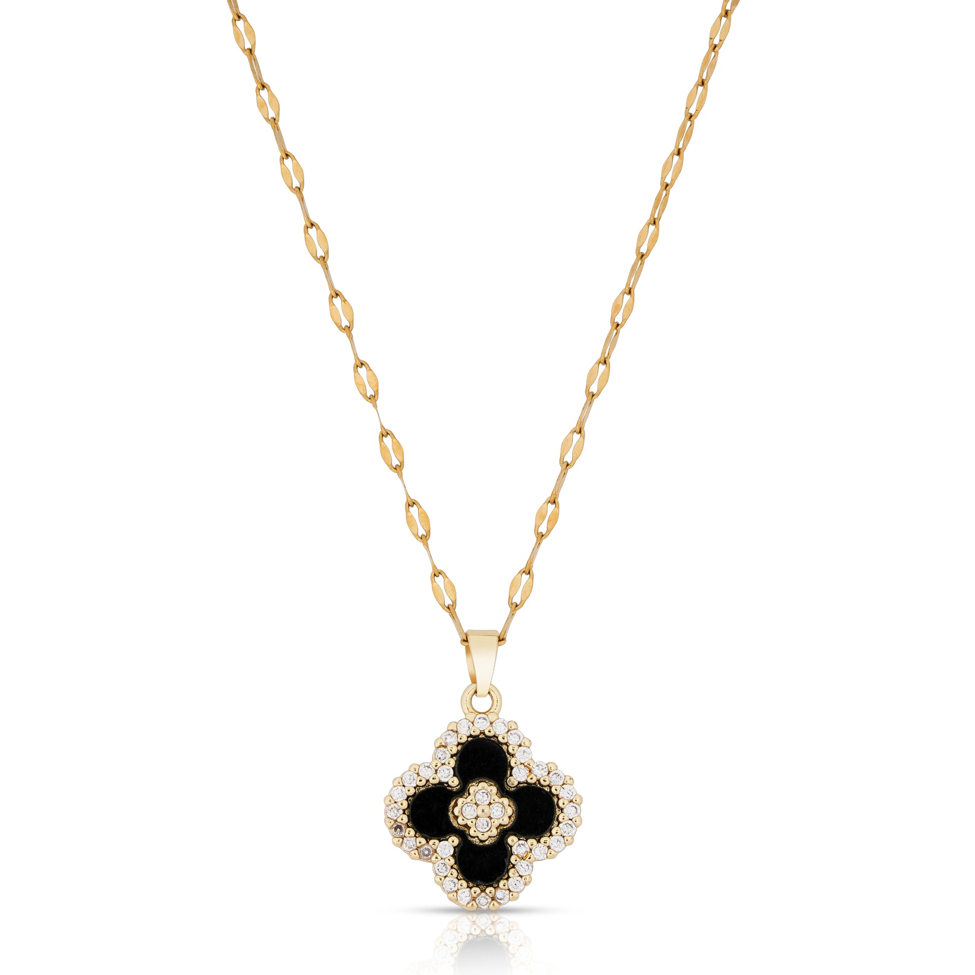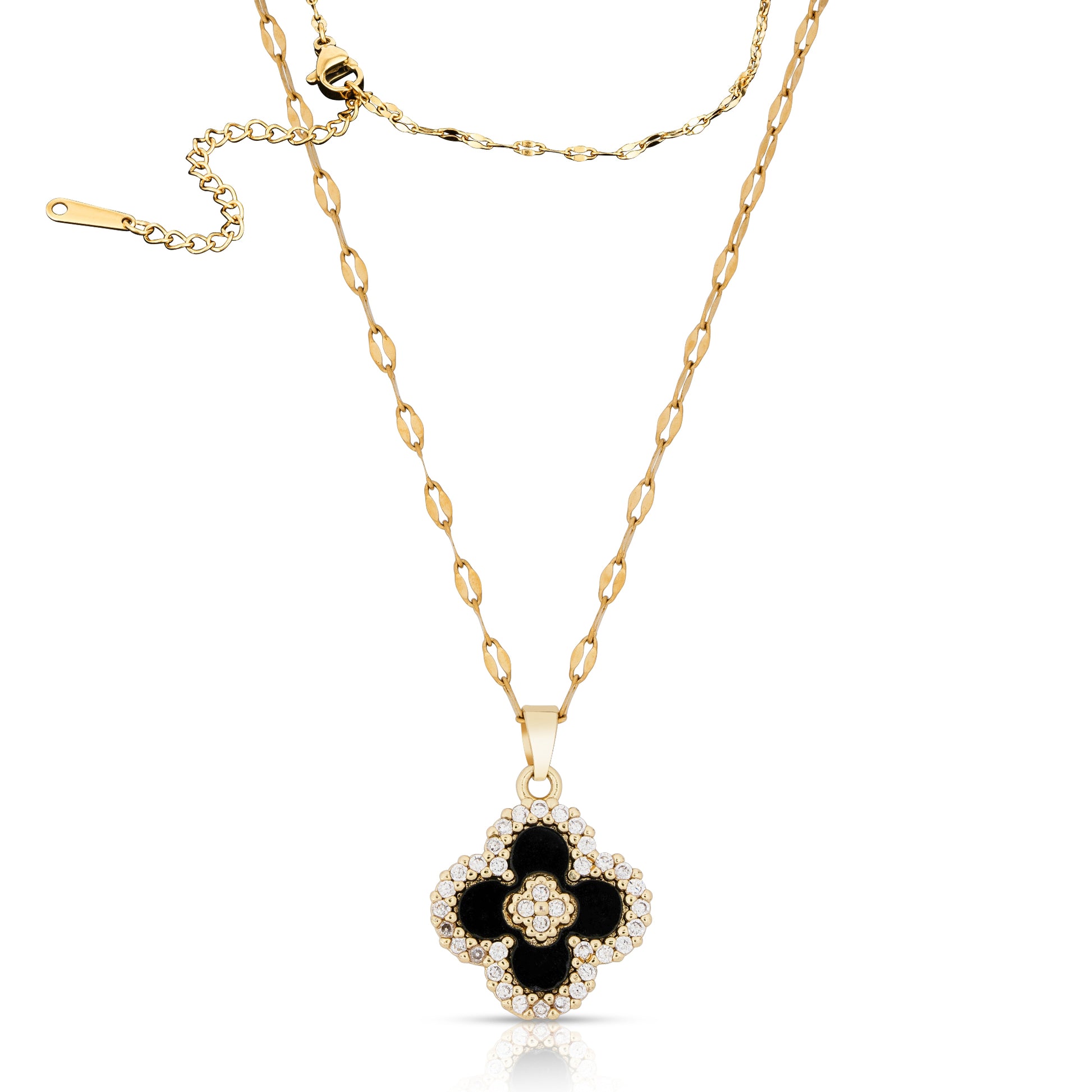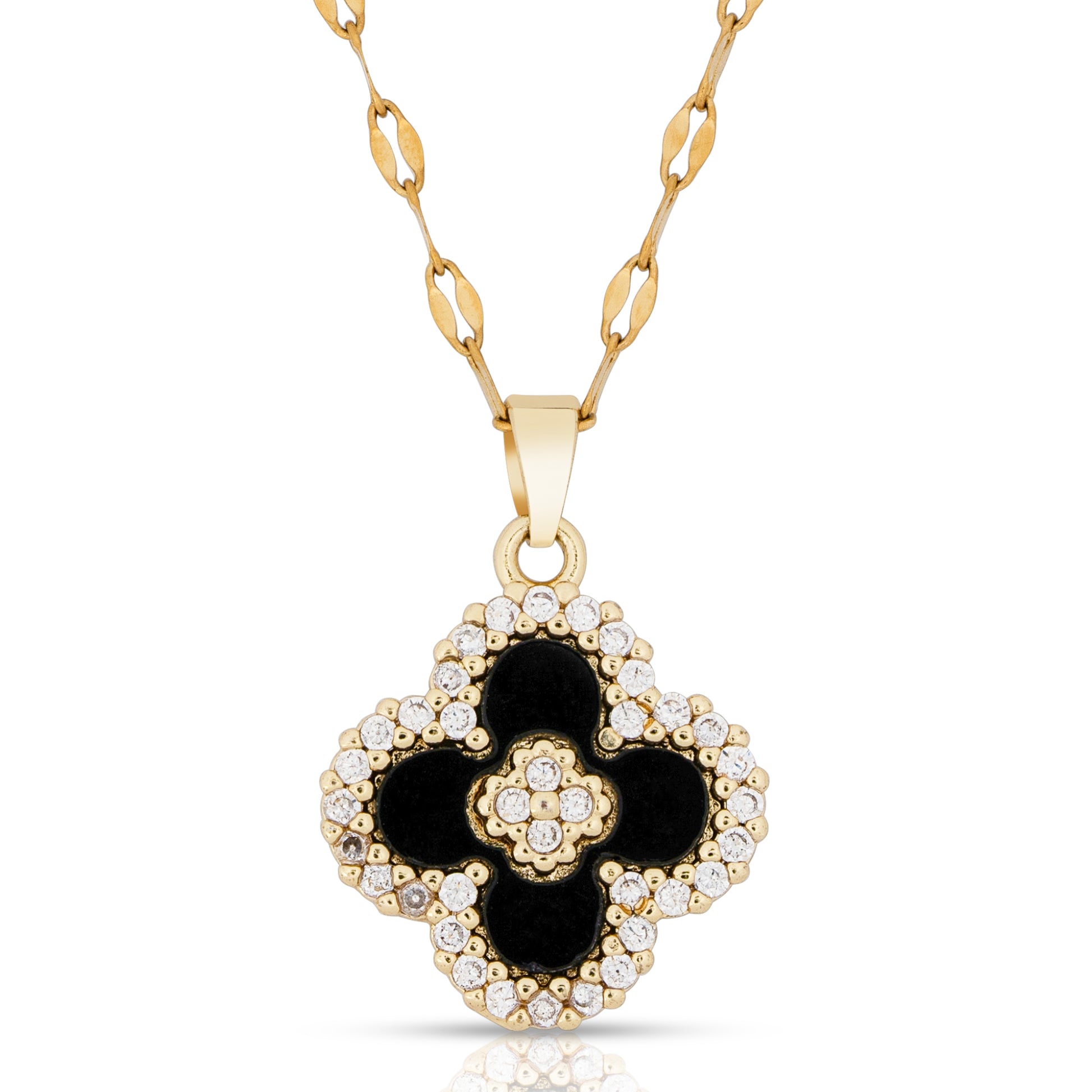 Four Leaf Clover Pendant Necklace for Women 18K Gold Plated with Black Agate & Cubic Zirconia / Dainty Lucky Clover Necklace Perfect for Any Occasion