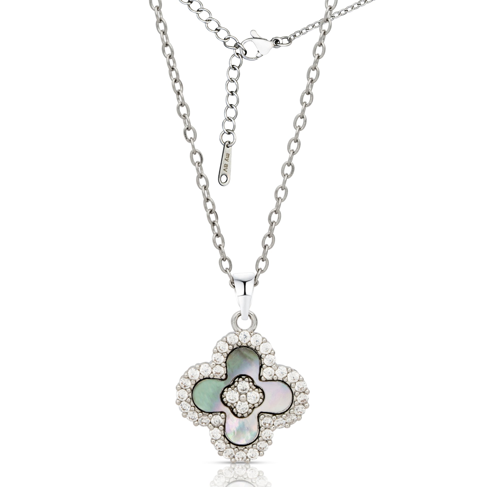 my Secret Victory 18K White Gold Plated Necklace Four Leaf Clover Pendant w/Grey Shell & Cubic Zirconia β Dainty Necklace Birthday Gift